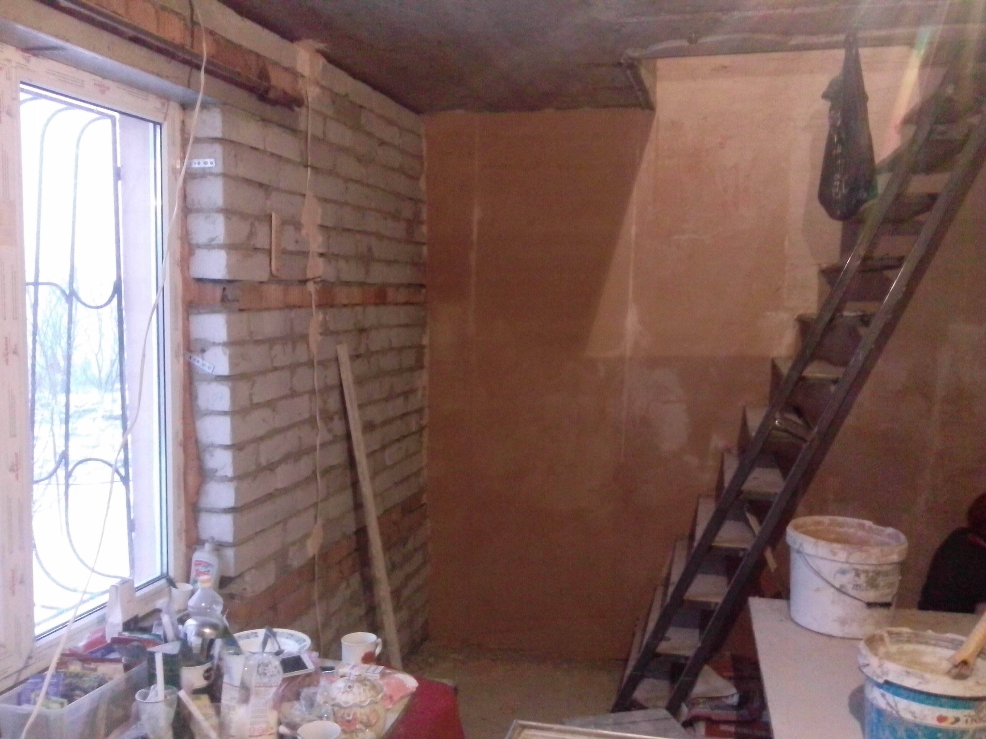Выполнили демонтаж деревянных полов, демонтаж дверей, шпаклевка и покраска стен структурной краской, изготовление и монтаж металлической лестницы, укладка кафеля на пол, монтаж гипсокартона на потолок, шпатлевка покраска гипсокартонового потолка, новая электрика,